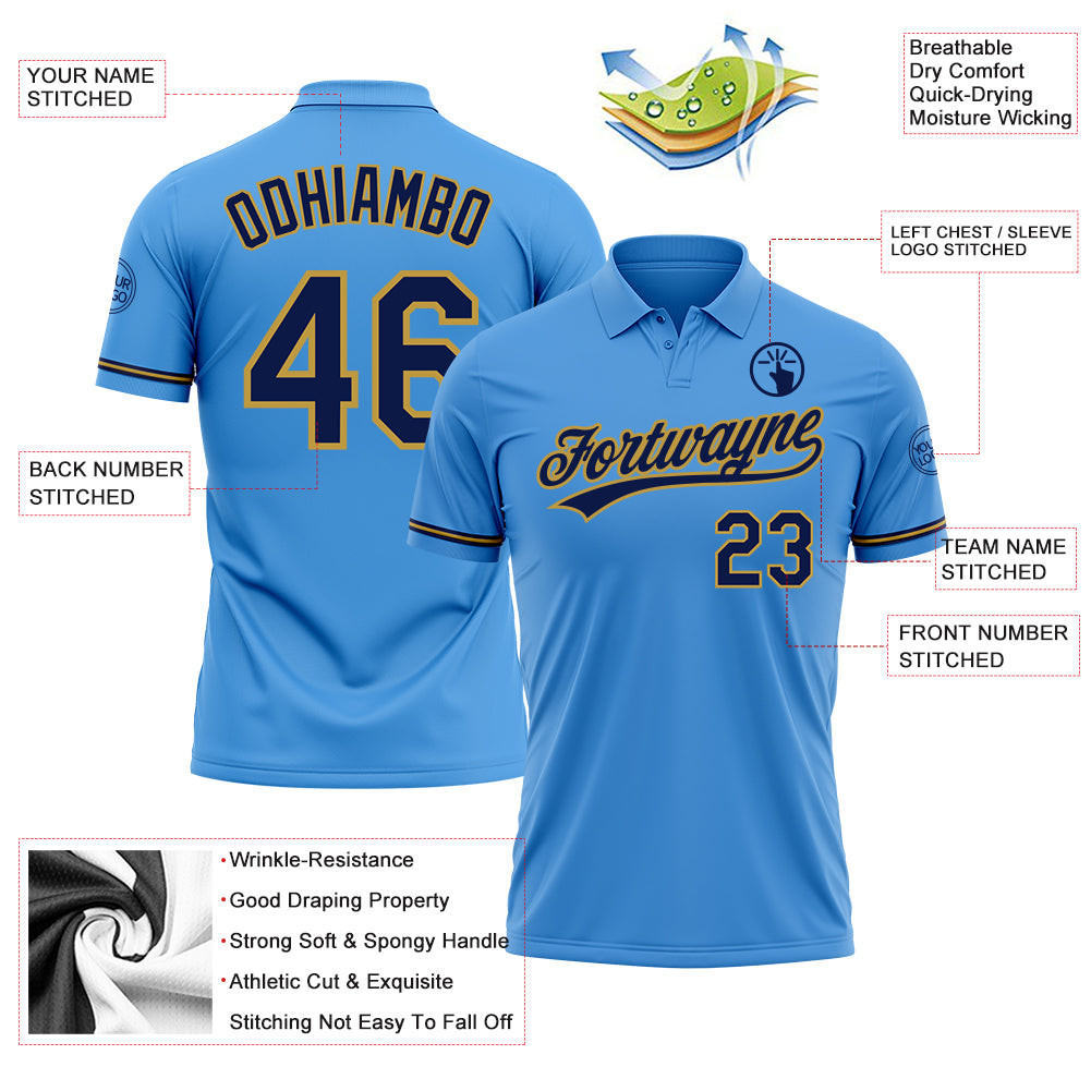 Personalized Powder Blue Navy-Old Gold Performance Vapor Golf Polo Shirt Team Custom Name and Number