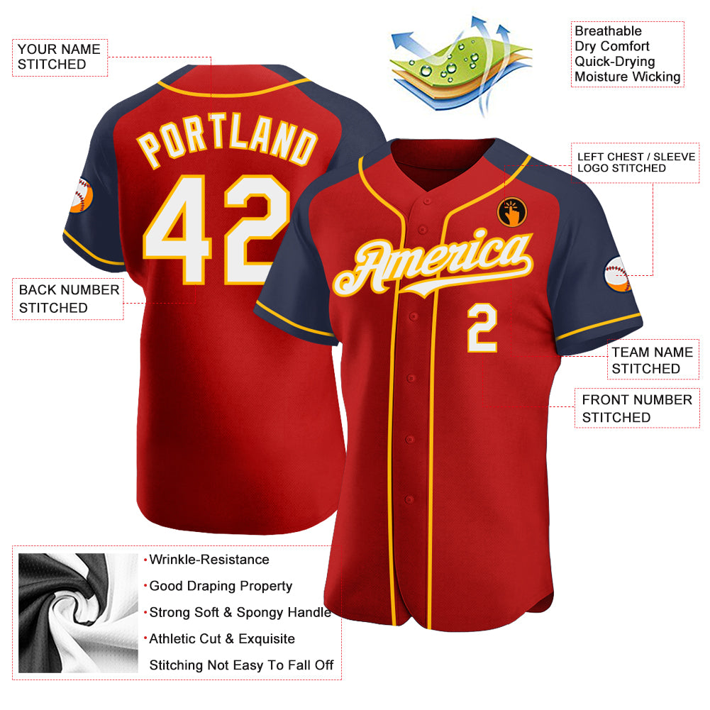 Personalized Red White Navy-Gold Authentic Raglan Sleeves Baseball Jersey Team Custom Name and Number