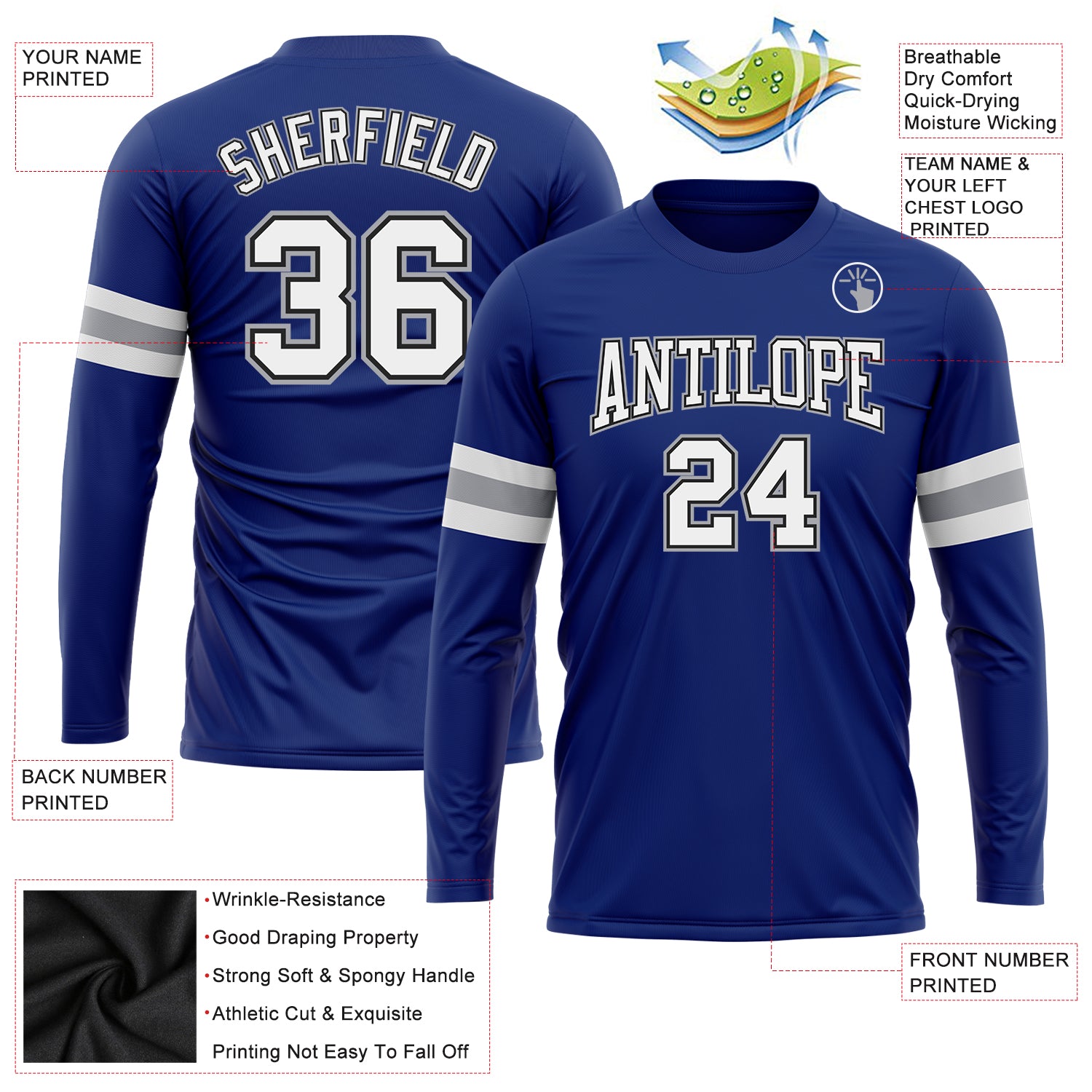 Custom Team Name and Number Long Sleeve Performance T-Shirt – Personalized Royal White Black-Gray Design Personalized Royal