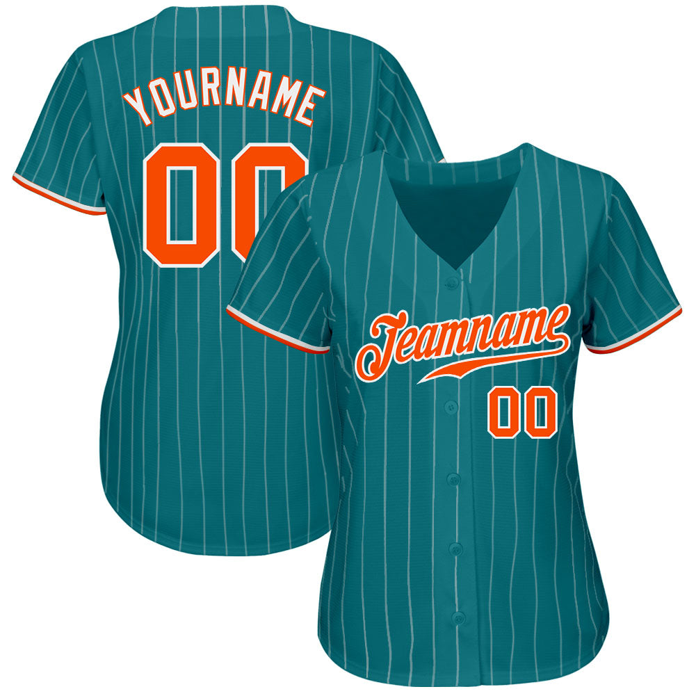 Custom Name and Number Authentic Baseball Jersey – Personalized Teal White Orange-White Pinstripe Design Personalized Teal