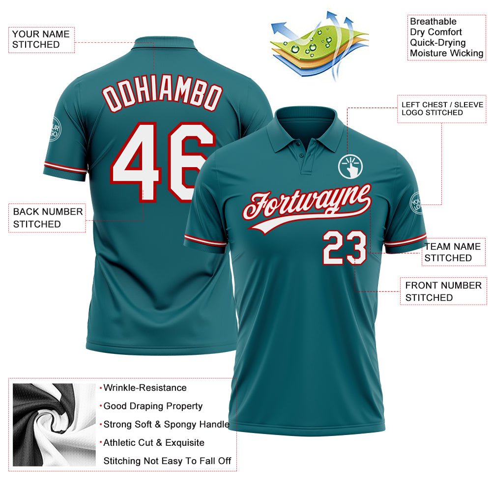 Custom Teal White Red Golf Polo Shirt with Performance Fabric – Personalized Team Name and Number Personalized Teal White-Red