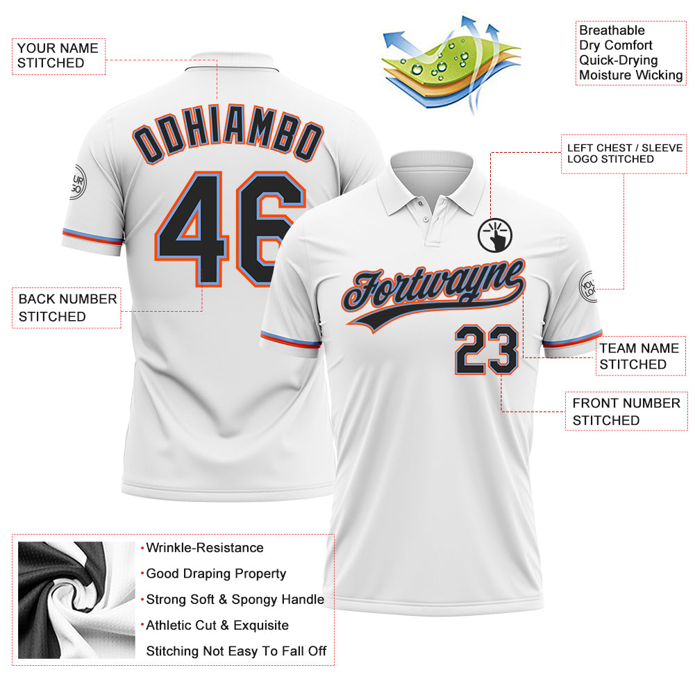 Custom Performance Vapor Golf Polo Shirt – Personalized White Black Powder Blue-Orange with Team Name & Number Personalized
