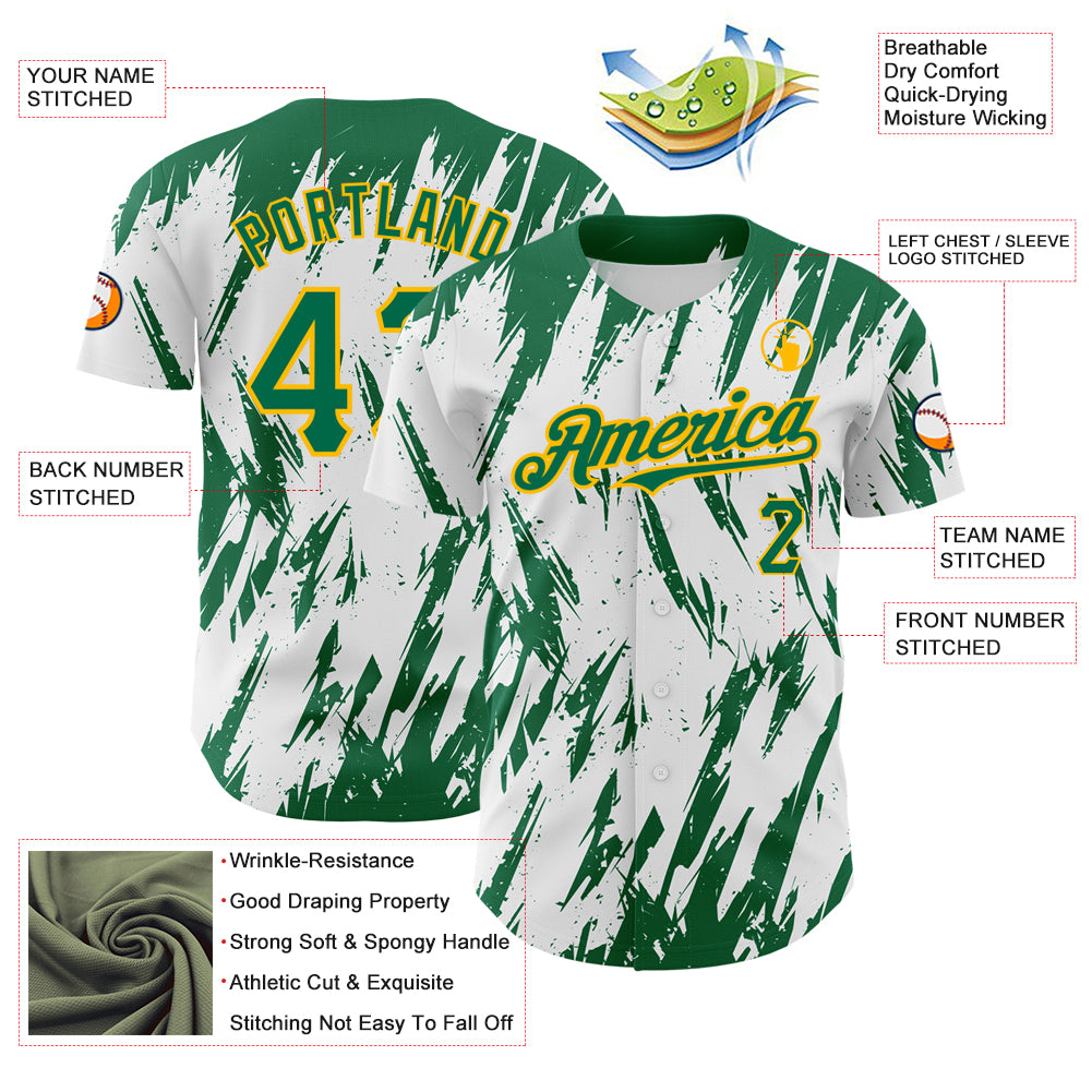 Personalized White Kelly Green-Gold 3D Pattern Design Abstract Sharp Shape Authentic Baseball Jersey Team Custom Name and Number