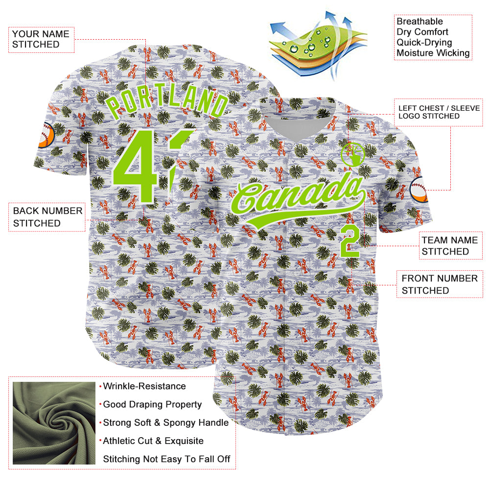 Personalized White Neon Green 3D Pattern Design Animal Lobster And Hawaii Palm Trees Authentic Baseball Jersey Team Custom Name and Number
