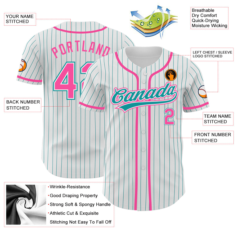 Personalized White Teal Pinstripe Pink Authentic Baseball Jersey Team Custom Name and Number